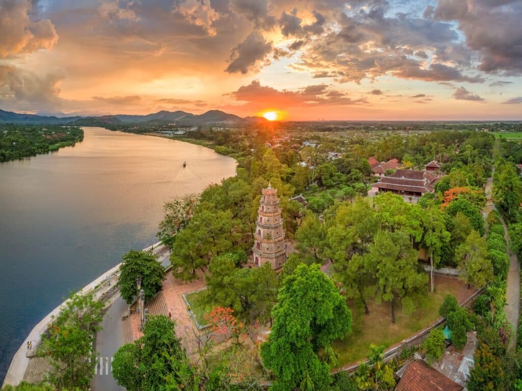 Hue lies in central Vietnam along the Perfume River, positioned between the Annamite foothills and the South China Sea. Geography here is riverine and coastal. The river curves gently through low plains before widening toward a lagoon system near the coast.