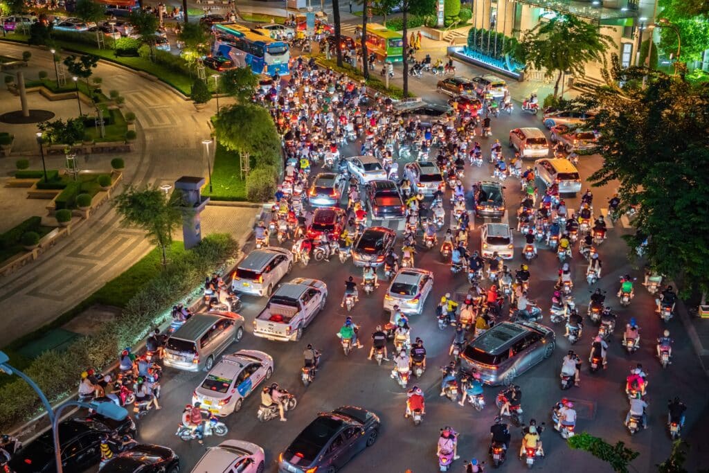Movement through Ho Chi Minh City follows a combination of river channels, radial roads, and dense urban streets. Geography emphasizes horizontal expansion, with urban density reinforced by the flat delta plain rather than by vertical elevation. The river system remains a defining geographic feature, guiding both transport and city planning.